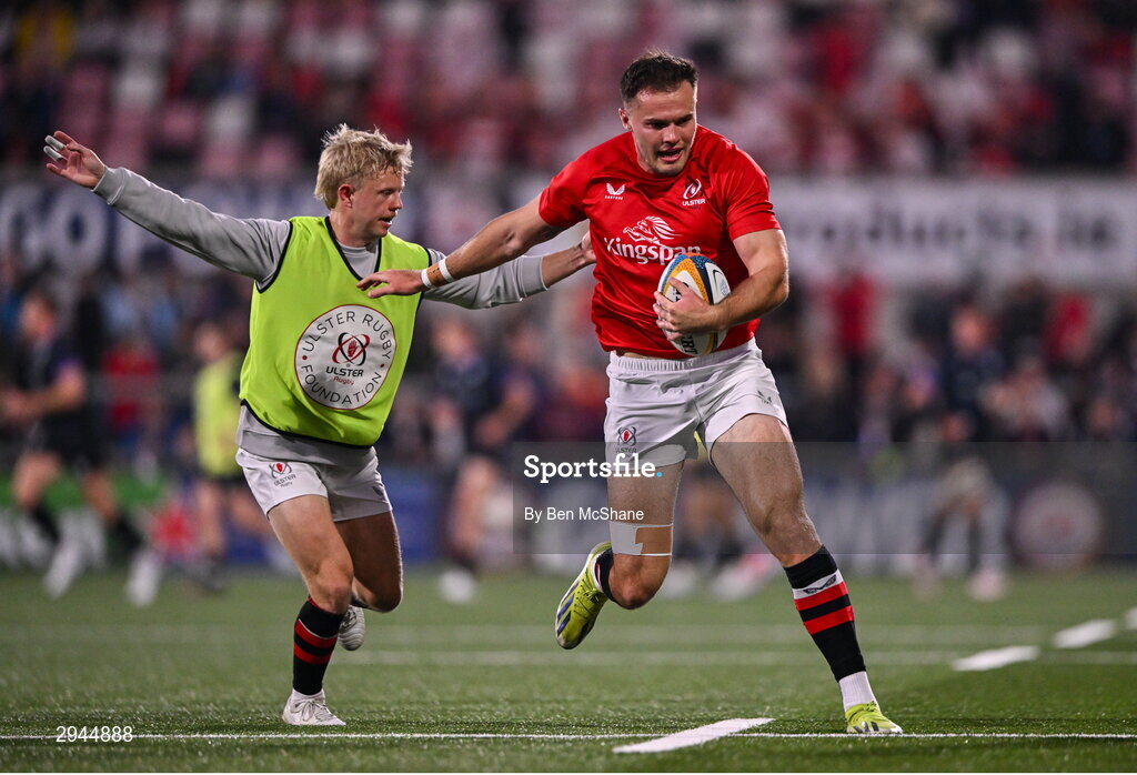 21 September 2024; Jacob Stockdale, right, and Dave Shanahan of Ulster warm-up before the United Rugby Championship match between Ulster and Glasgow Warriors at The Kingspan Stadium in Belfast. Photo by Ben McShane/Sportsfile