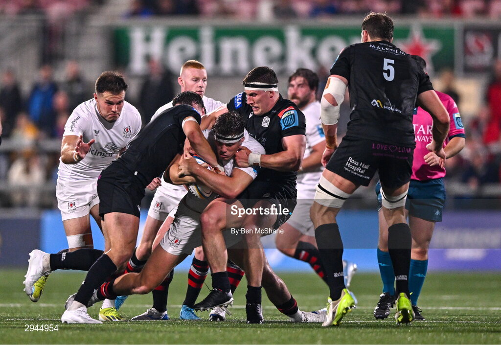 21 September 2024; Jude Postlethwaite of Ulster is tackled by Tom Jordan, left, and Rory Darge of Glasgow Warriors during the United Rugby Championship match between Ulster and Glasgow Warriors at The Kingspan Stadium in Belfast. Photo by Ben McShane/Sportsfile