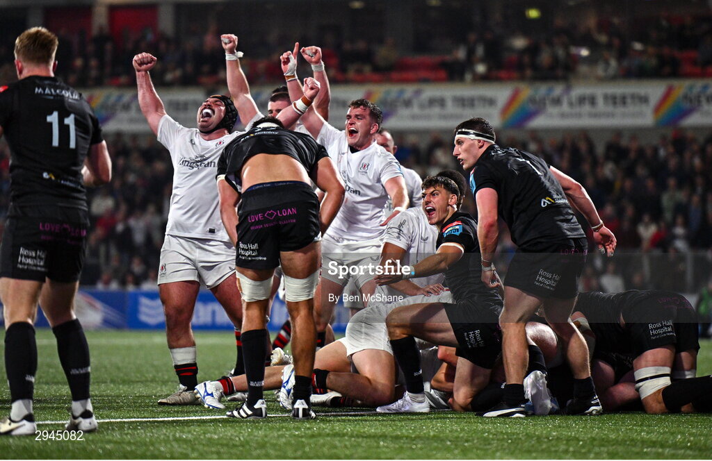 21 September 2024; Ulster players celebrate their match winning try during the United Rugby Championship match between Ulster and Glasgow Warriors at The Kingspan Stadium in Belfast. Photo by Ben McShane/Sportsfile