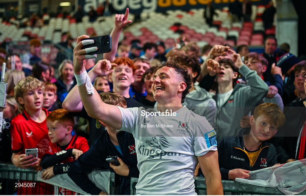21 September 2024; Mike Lowry of Ulster takes a selfie with supporters after his side's victory in the United Rugby Championship match between Ulster and Glasgow Warriors at The Kingspan Stadium in Belfast. Photo by Ben McShane/Sportsfile