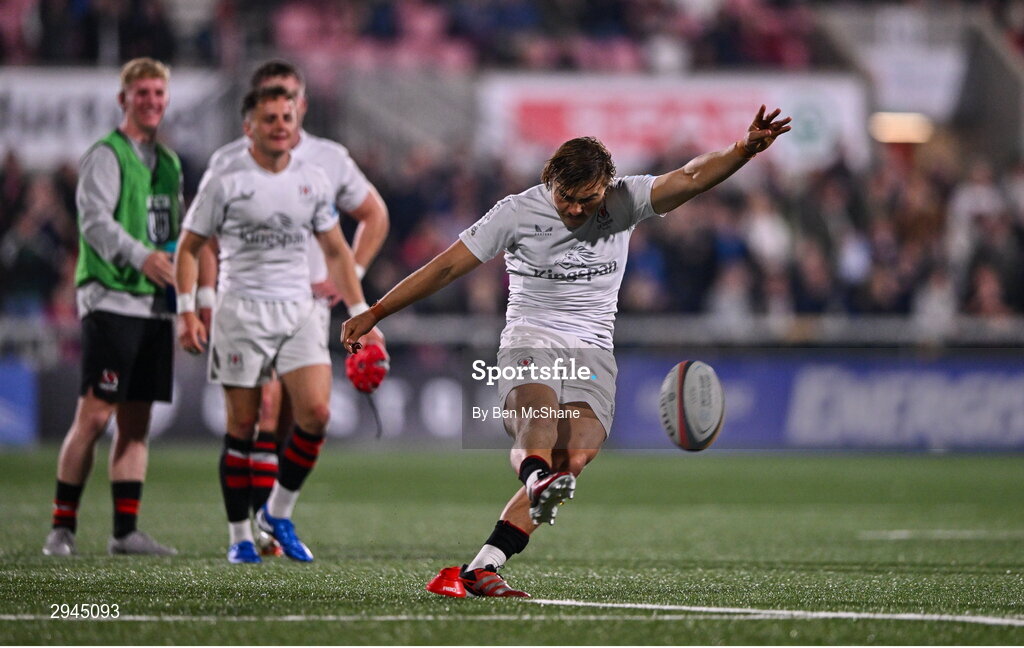 21 September 2024; Aidan Morgan of Ulster kicks a conversion during the United Rugby Championship match between Ulster and Glasgow Warriors at The Kingspan Stadium in Belfast. Photo by Ben McShane/Sportsfile