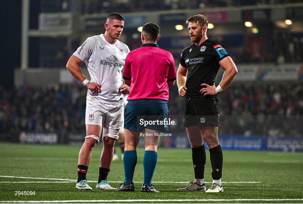 21 September 2024; Referee Adam Jones in conversation with Nick Timoney of Ulster and Kyle Steyn of Glasgow Warriors after Ulster scored their second try during the United Rugby Championship match between Ulster and Glasgow Warriors at The Kingspan Stadium in Belfast. Photo by Ben McShane/Sportsfile