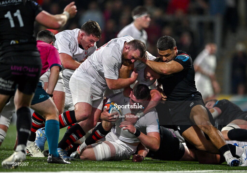 21 September 2024; Harry Sheridan of Ulster holds possession during the United Rugby Championship match between Ulster and Glasgow Warriors at The Kingspan Stadium in Belfast. Photo by Ben McShane/Sportsfile