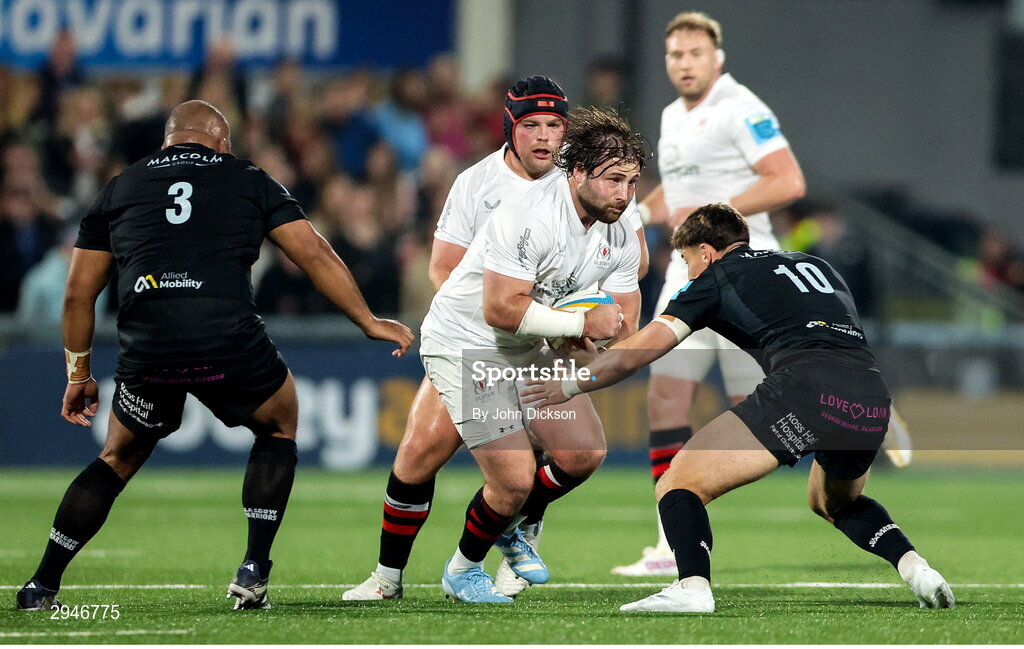 21 September 2024; John Andrew of Ulster is tackled by Tom Jordan of Glasgow Warriors during the United Rugby Championship match between Ulster and Glasgow Warriors at The Kingspan Stadium in Belfast. Photo by John Dickson/Sportsfile