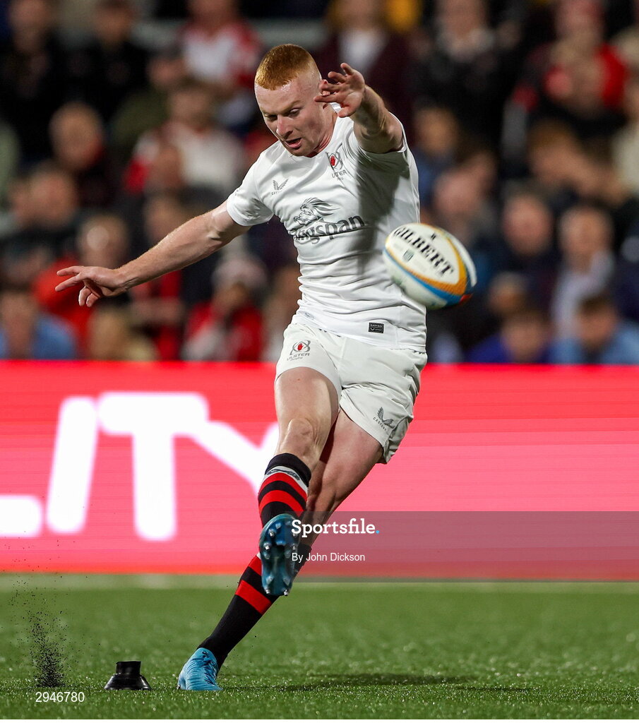21 September 2024; Nathan Doak of Ulster kicks a conversion during the United Rugby Championship match between Ulster and Glasgow Warriors at The Kingspan Stadium in Belfast. Photo by John Dickson/Sportsfile