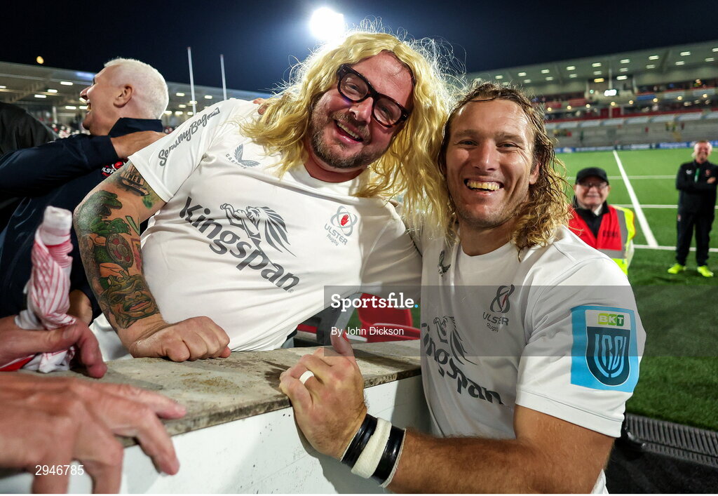 21 September 2024; Werner Kok of Ulster with a supporter after the United Rugby Championship match between Ulster and Glasgow Warriors at The Kingspan Stadium in Belfast. Photo by John Dickson/Sportsfile
