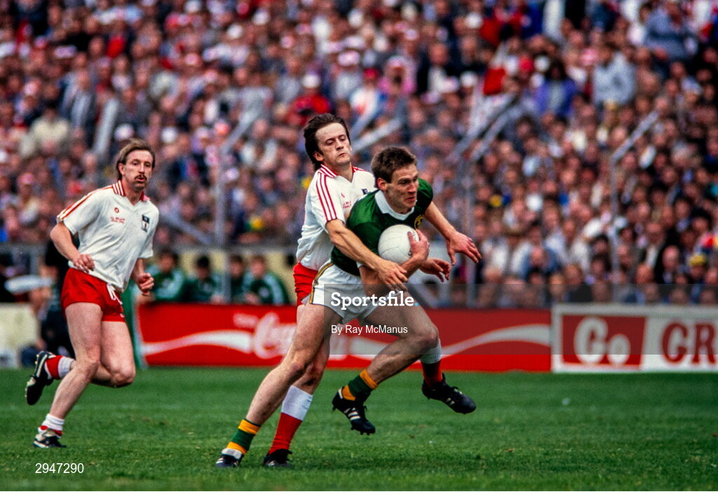 21 September 1986; Tom Spillane of Kerry is tackled by Paudge Quinn of Tyrone during the All-Ireland Senior Football Championship final between Tyrone and Kerry at Croke Park in Dublin. Photo by Ray McManus/Sportsfile