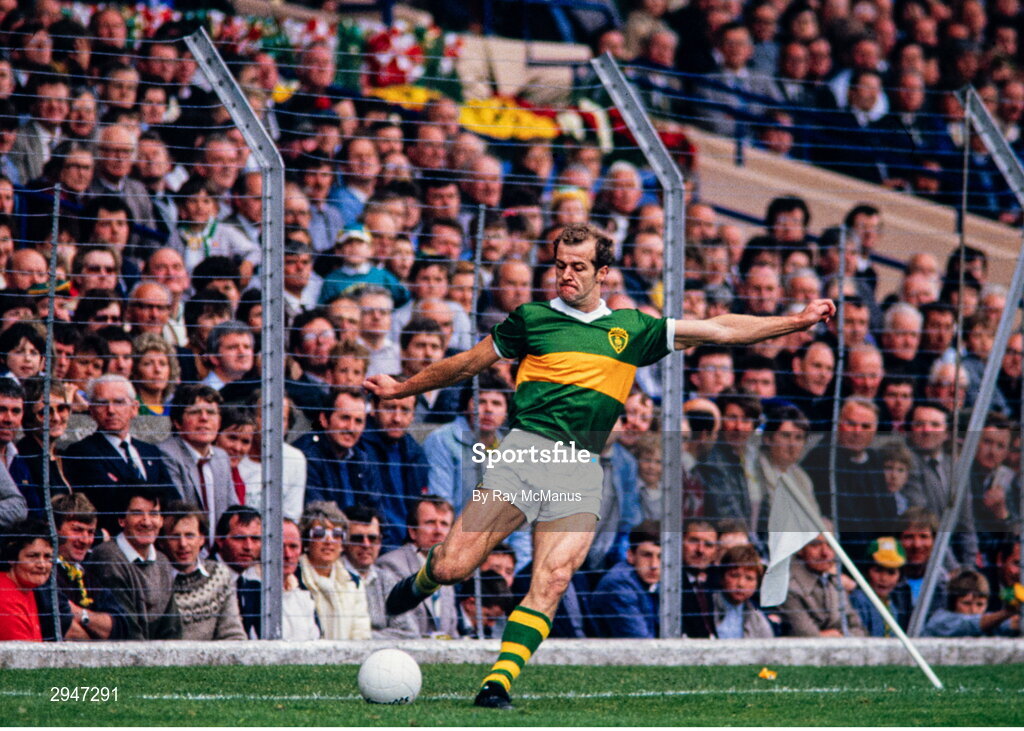 21 September 1986; Jack O'Shea of Kerry takes a sideline ball during the All-Ireland Senior Football Championship final between Tyrone and Kerry at Croke Park in Dublin. Photo by Ray McManus/Sportsfile