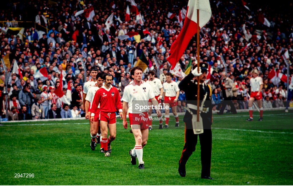 21 September 1986; Tyrone captain Eugene McKenna leads his teammates, including goalkeeper Aidan Skelton, in the pre-match parade before the All-Ireland Senior Football Championship final between Tyrone and Kerry at Croke Park in Dublin. Photo by Ray McManus/Sportsfile