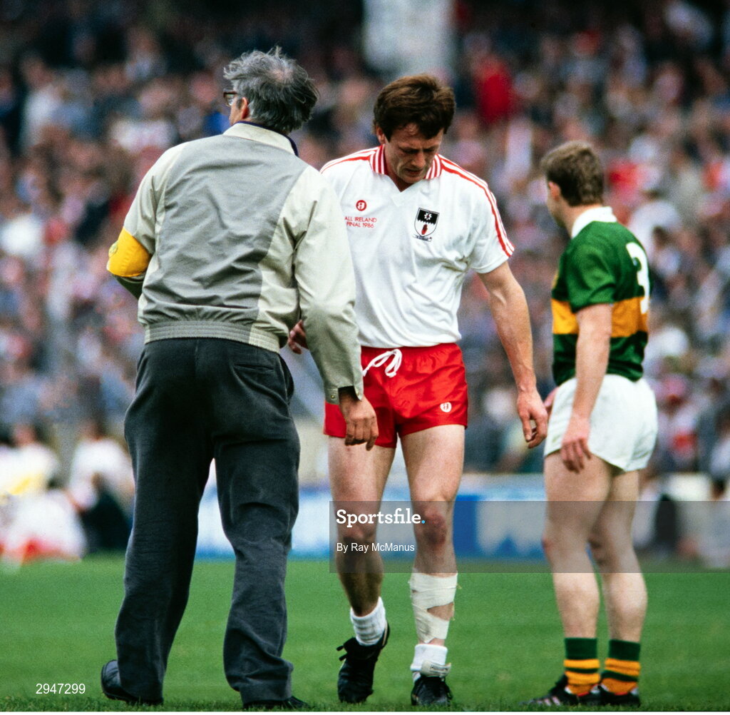 21 September 1986; Tyrone captain Eugene McKenna, right, and manager Art McRory during the All-Ireland Senior Football Championship final between Tyrone and Kerry at Croke Park in Dublin. Photo by Ray McManus/Sportsfile