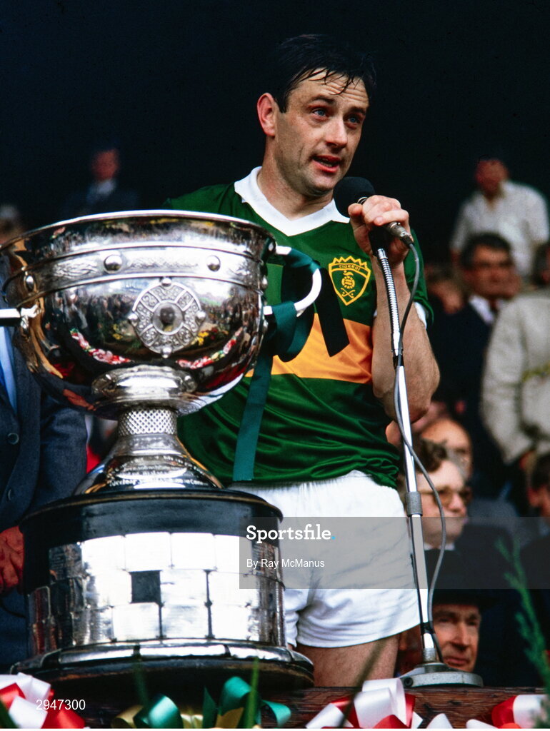 21 September 1986; Kerry captain Tommy Doyle makes his speech after lifting the Sam Maguire Cup following the All-Ireland Senior Football Championship final between Tyrone and Kerry at Croke Park in Dublin. Photo by Ray McManus/Sportsfile