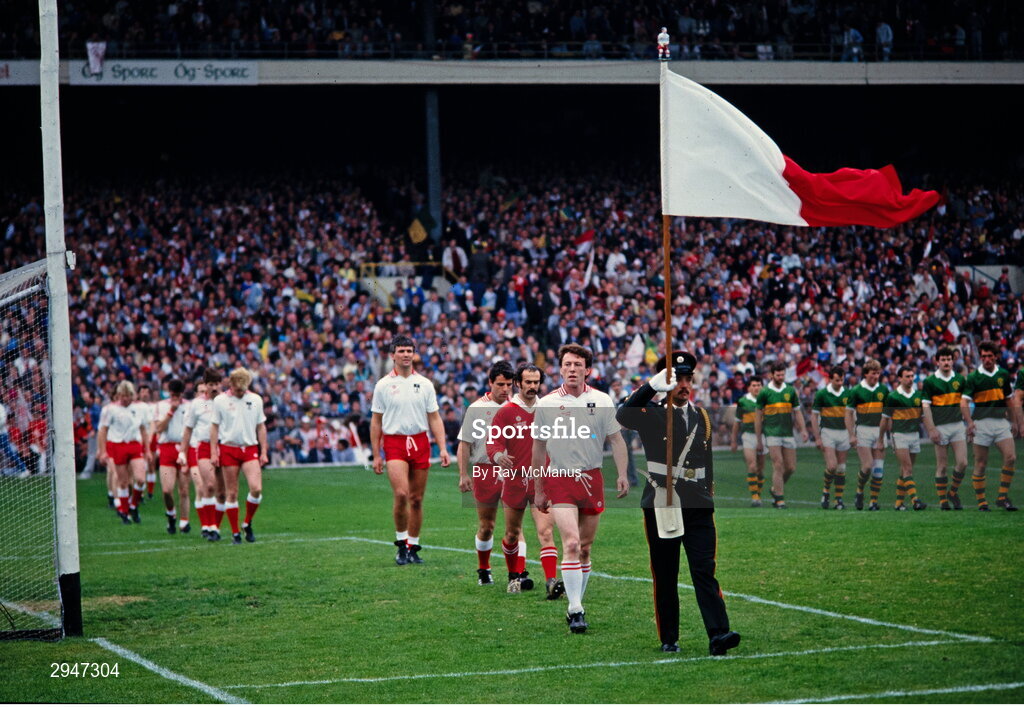 21 September 1986; Tyrone captain Eugene McKenna leads his side in the pre-match parade before the All-Ireland Senior Football Championship final between Tyrone and Kerry at Croke Park in Dublin. Photo by Ray McManus/Sportsfile
