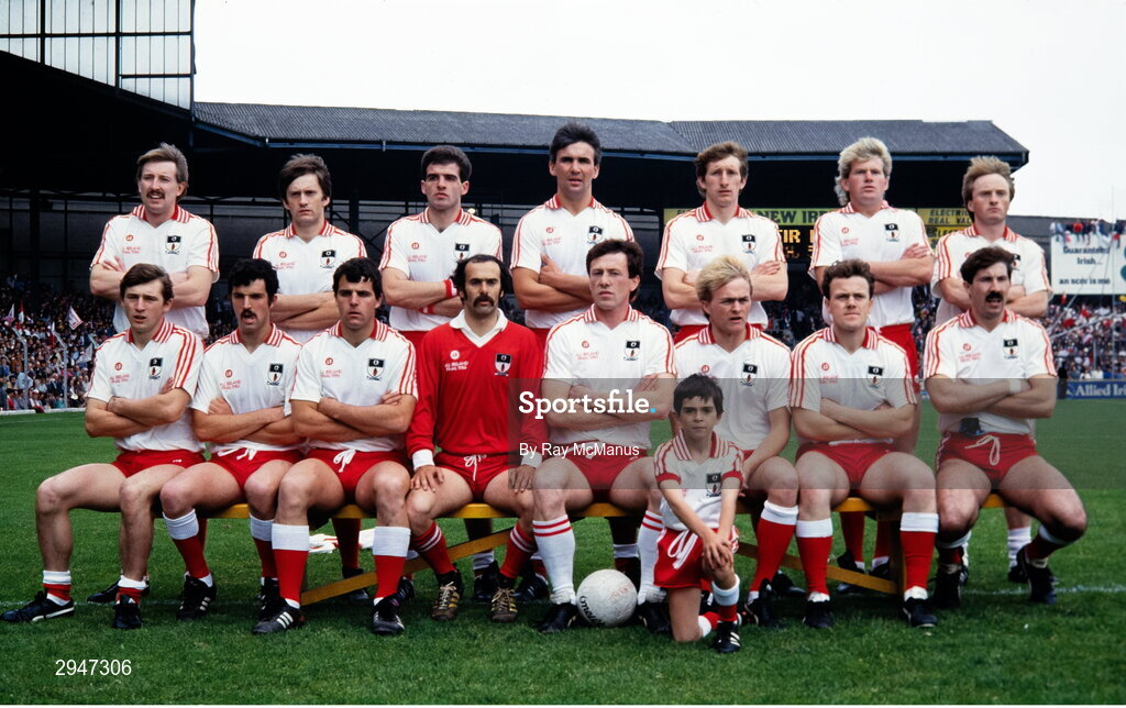21 September 1986; The Tyrone team, back row, from left, Damien O'Hagan, Paudge Quinn, Paddy Ball, Kieran McGarvey, Martin Dorman, Harry McClure, Plunkett Donaghy, Stephen Conway and Sean McNally. Front, from left, Michael Mallon, Joe Mallon, Aidan Skelton, Eugene McKenna, mascot Ciaran Quinn, John Lynch, Noel McGinn and Kevin McCabe before the All-Ireland Senior Football Championship final between Tyrone and Kerry at Croke Park in Dublin. Photo by Ray McManus/Sportsfile