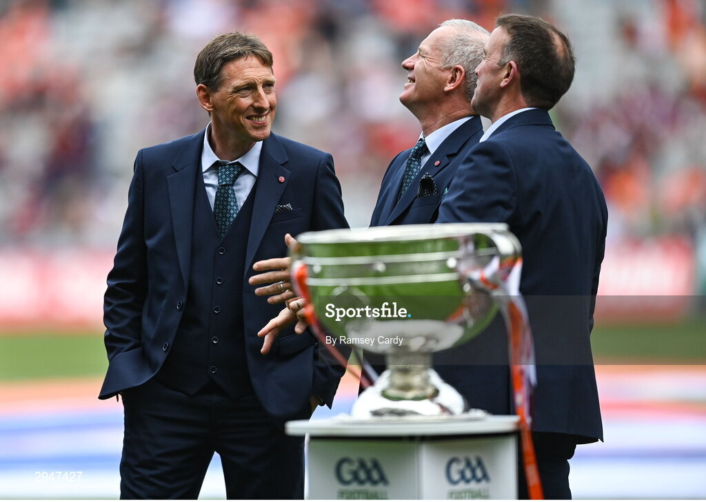 28 July 2024; Trevor Giles, left, of the 1999 All-Ireland winning Meath football jubilee team who were honoured before the GAA Football All-Ireland Senior Championship Final match between Armagh and Galway at Croke Park in Dublin. Photo by Ramsey Cardy/Sportsfile