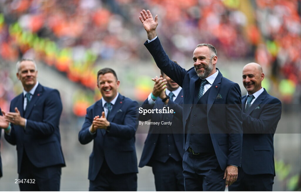 28 July 2024; Hank Traynor of the 1999 All-Ireland winning Meath football jubilee team who were honoured before the GAA Football All-Ireland Senior Championship Final match between Armagh and Galway at Croke Park in Dublin. Photo by Ramsey Cardy/Sportsfile