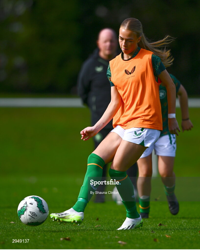 28 September 2024; Beatrice Silickaite of Republic of Ireland warms up before the women's U17 international friendly match between Republic of Ireland and Cymru at the AUL Complex in Clonsaugh, Dublin. Photo by Shauna Clinton/Sportsfile