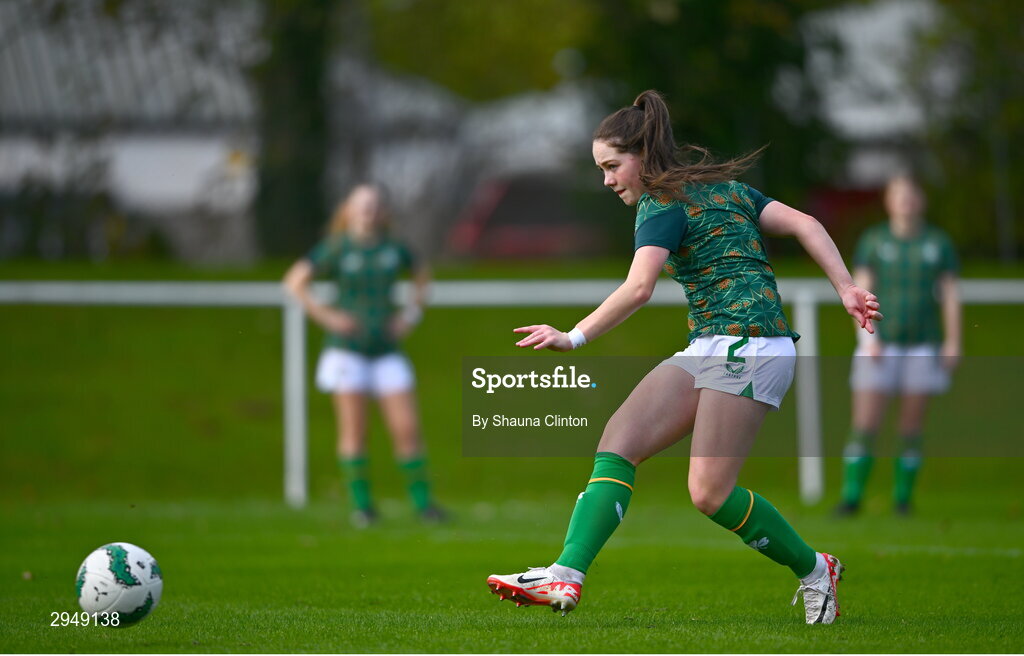 28 September 2024; Leah McGrath of Republic of Ireland warms up before the women's U17 international friendly match between Republic of Ireland and Cymru at the AUL Complex in Clonsaugh, Dublin. Photo by Shauna Clinton/Sportsfile