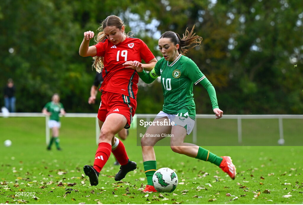 28 September 2024; Ella Kelly of Republic of Ireland in action against Lily Nicholls of Cymru during the women's U17 international friendly match between Republic of Ireland and Cymru at the AUL Complex in Clonsaugh, Dublin. Photo by Shauna Clinton/Sportsfile