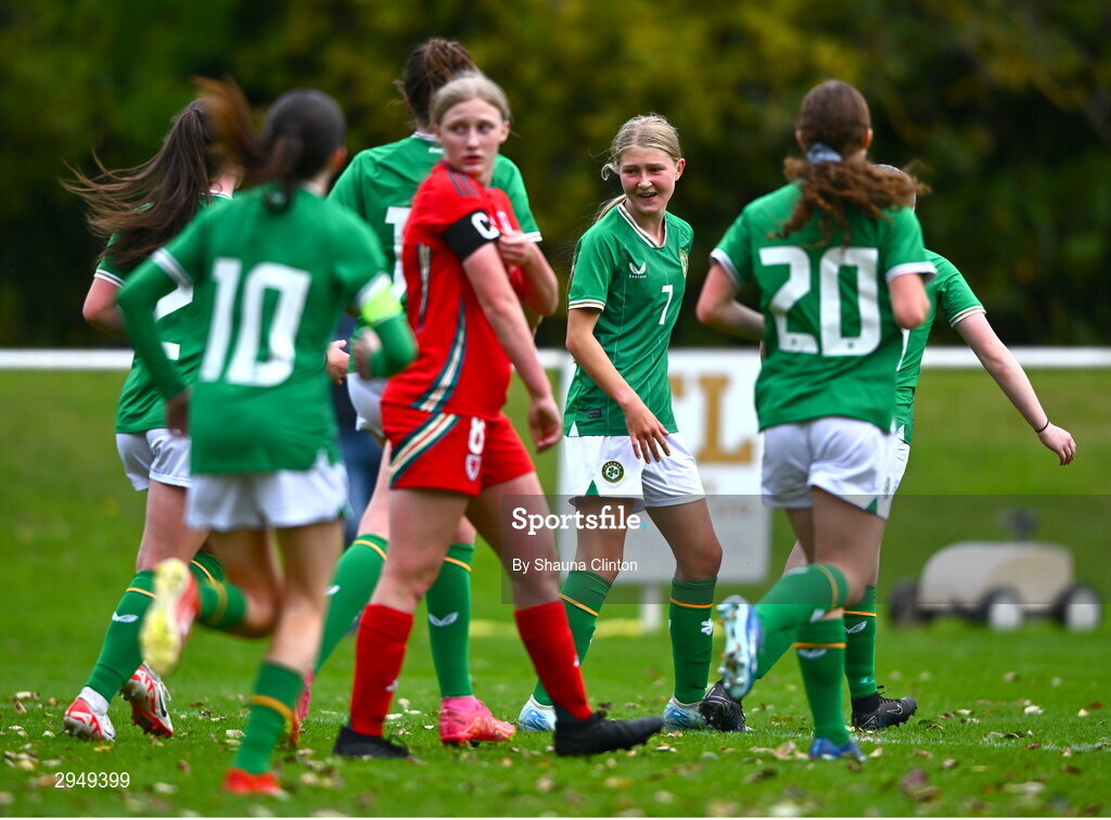 28 September 2024; Madison McGuane of Republic of Ireland, second from right, celebrates with team-mates after scoring her side's second goal during the women's U17 international friendly match between Republic of Ireland and Cymru at the AUL Complex in Clonsaugh, Dublin. Photo by Shauna Clinton/Sportsfile