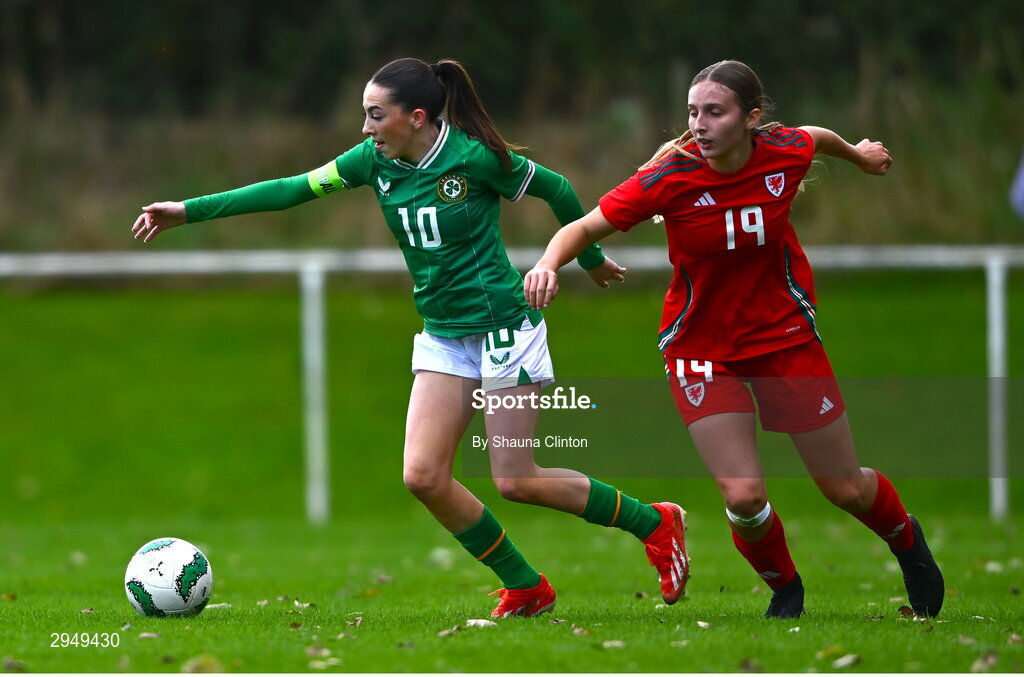 28 September 2024; Ella Kelly of Republic of Ireland in action against Lily Nicholls of Cymru during the women's U17 international friendly match between Republic of Ireland and Cymru at the AUL Complex in Clonsaugh, Dublin. Photo by Shauna Clinton/Sportsfile