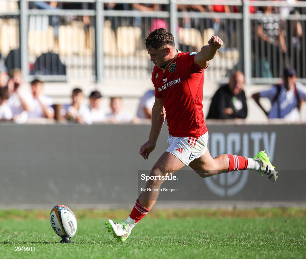 28 September 2024; Tony Butler of Munster converts a try during the United Rugby Championship match between Zebre Parma and Munster at Stadio Sergio Lanfranchi in Parma, Italy. Photo by Roberto Bregani/Sportsfile