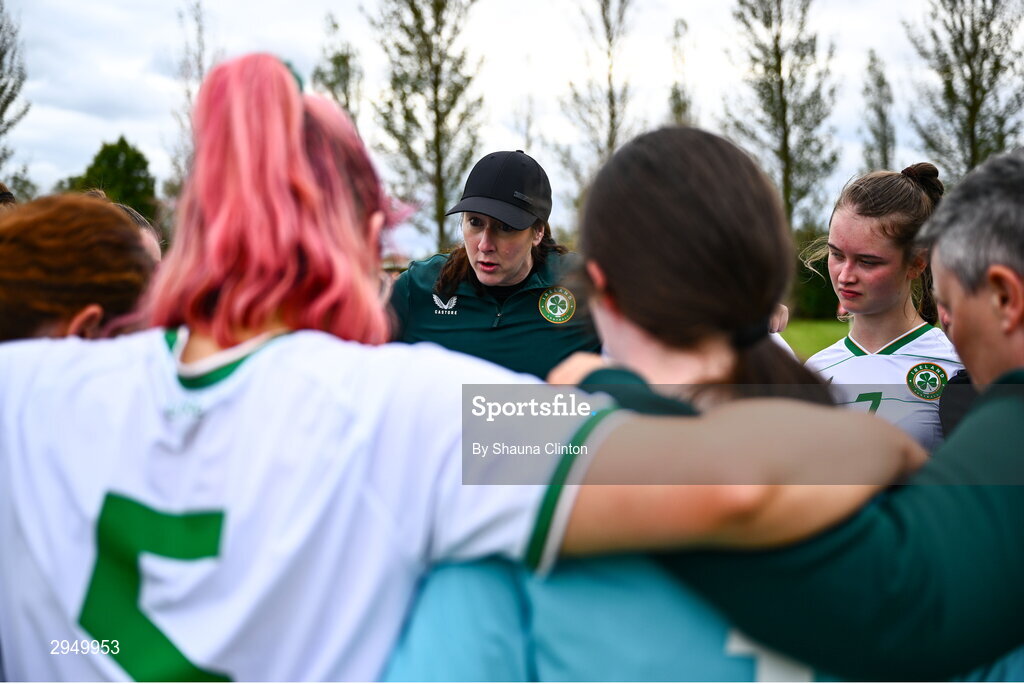 28 September 2024; Ireland head coach Aisling Conway, left, speaks to her team after their side's defeat in the Cerebal Palsy women's international series match between Ireland and USA at the AUL Complex in Dublin. Photo by Shauna Clinton/Sportsfile