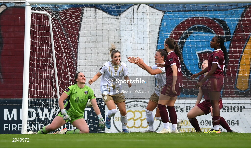 28 September 2024; Kate Mooney of Shelbourne celebrates after scoring her side's first goal during the SSE Airtricity Women's Premier Division match between Galway United and Shelbourne at Eamonn Deacy Park in Galway. Photo by Stephen McCarthy/Sportsfile