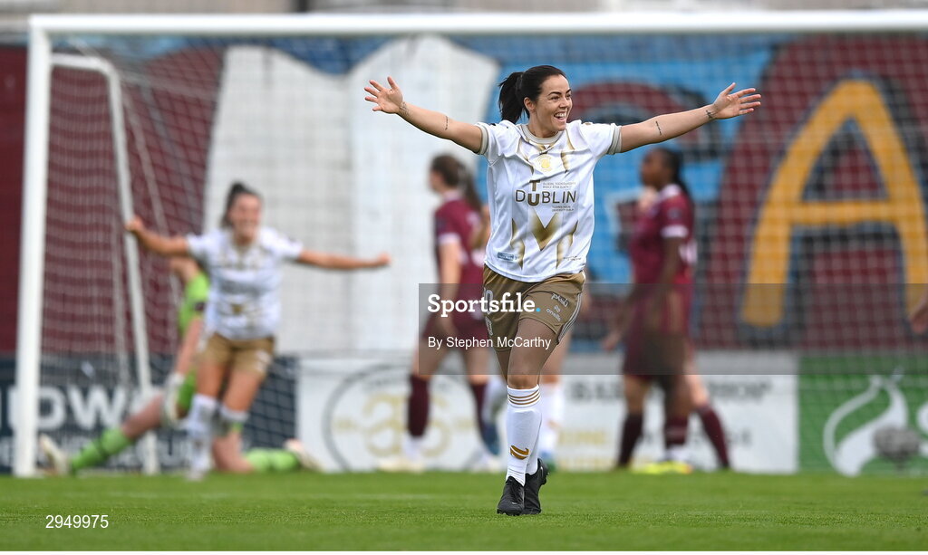 28 September 2024; Noelle Murray of Shelbourne celebrates her side's first goal, scored by team-mate Kate Mooney, during the SSE Airtricity Women's Premier Division match between Galway United and Shelbourne at Eamonn Deacy Park in Galway. Photo by Stephen McCarthy/Sportsfile