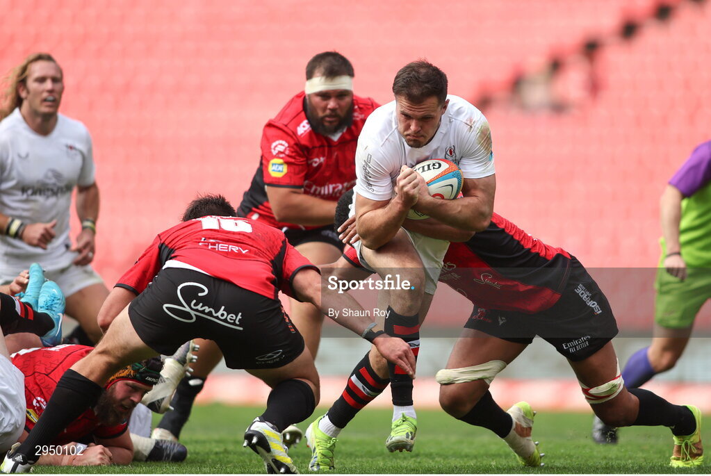 28 September 2024; Jacob Stockdale of Ulster is tackled by Franco Marais and Darrien Landsberg of Emirates Lions during the United Rugby Championship match between Emirates Lions and Ulster at Emirates Airline Park in Johannesburg, South Africa. Photo by Shaun Roy/Sportsfile