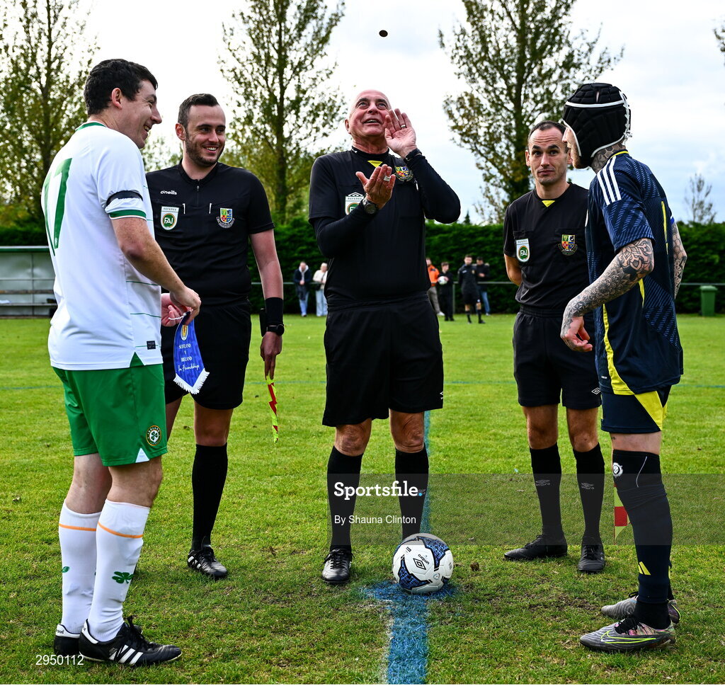 28 September 2024; Ireland captain Joseph Markey and Scotland captain Jon McFarlane look on during the coin toss before the Cerebal Palsy men's international series match between Ireland and Scotland at the AUL Complex in Dublin. Photo by Shauna Clinton/Sportsfile