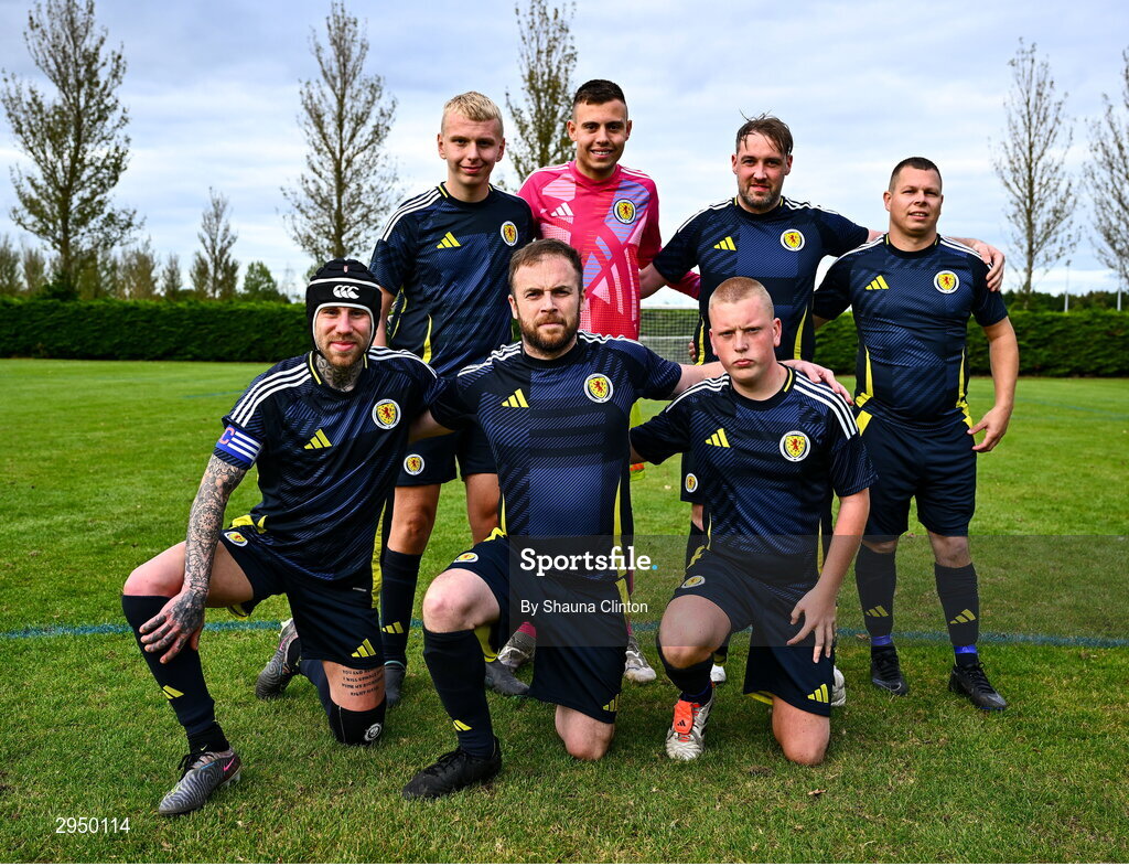 28 September 2024; The Scotland team pose for a team photograph before the Cerebal Palsy men's international series match between Ireland and Scotland at the AUL Complex in Dublin. Photo by Shauna Clinton/Sportsfile