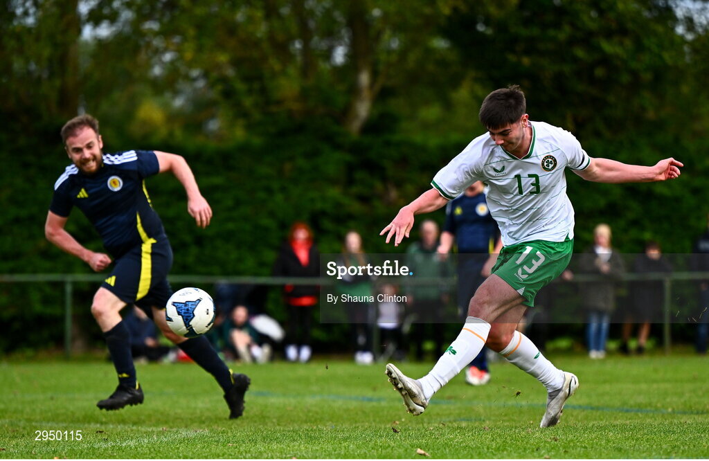 28 September 2024; Charlie Byrne of Ireland has a shot on goal during the Cerebal Palsy men's international series match between Ireland and Scotland at the AUL Complex in Dublin. Photo by Shauna Clinton/Sportsfile