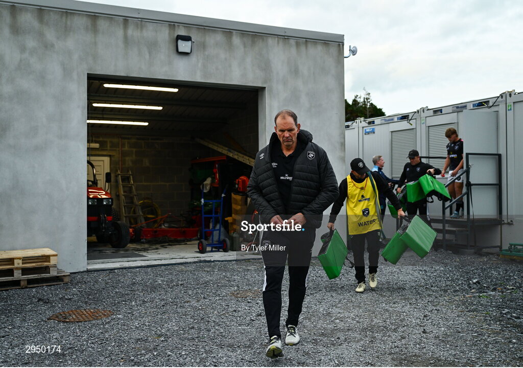 28 September 2024; Hollywoodbets Sharks head coach John Plumtree makes his way to the pitch past the club shed before the United Rugby Championship match between Connacht and Hollywoodbets Sharks at Dexcom Stadium in Galway. Photo by Tyler Miller/Sportsfile