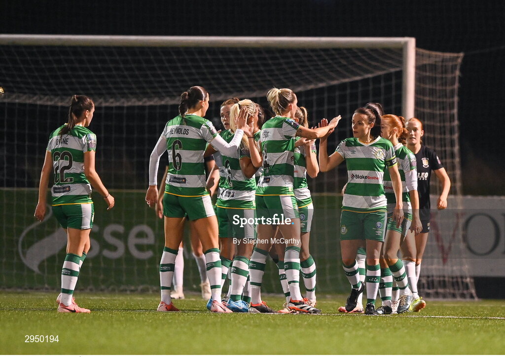 28 September 2024; Áine O'Gorman, right, celebrates with her Shamrock Rovers team-mates after scoring their side's first goal during the SSE Airtricity Women's Premier Division match between Athlone Town and Shamrock Rovers at Athlone Town Stadium in Westmeath. Photo by Stephen McCarthy/Sportsfile