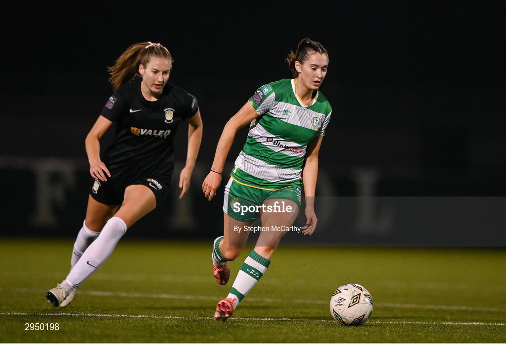 28 September 2024; Melissa O'Kane of Shamrock Rovers in action against Jesi Lynne Rossman of Athlone Town during the SSE Airtricity Women's Premier Division match between Athlone Town and Shamrock Rovers at Athlone Town Stadium in Westmeath. Photo by Stephen McCarthy/Sportsfile
