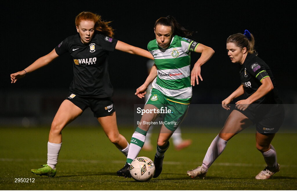 28 September 2024; Áine O'Gorman of Shamrock Rovers in action against Kate Slevin, left, and Laurie Ryan of Athlone Town during the SSE Airtricity Women's Premier Division match between Athlone Town and Shamrock Rovers at Athlone Town Stadium in Westmeath. Photo by Stephen McCarthy/Sportsfile