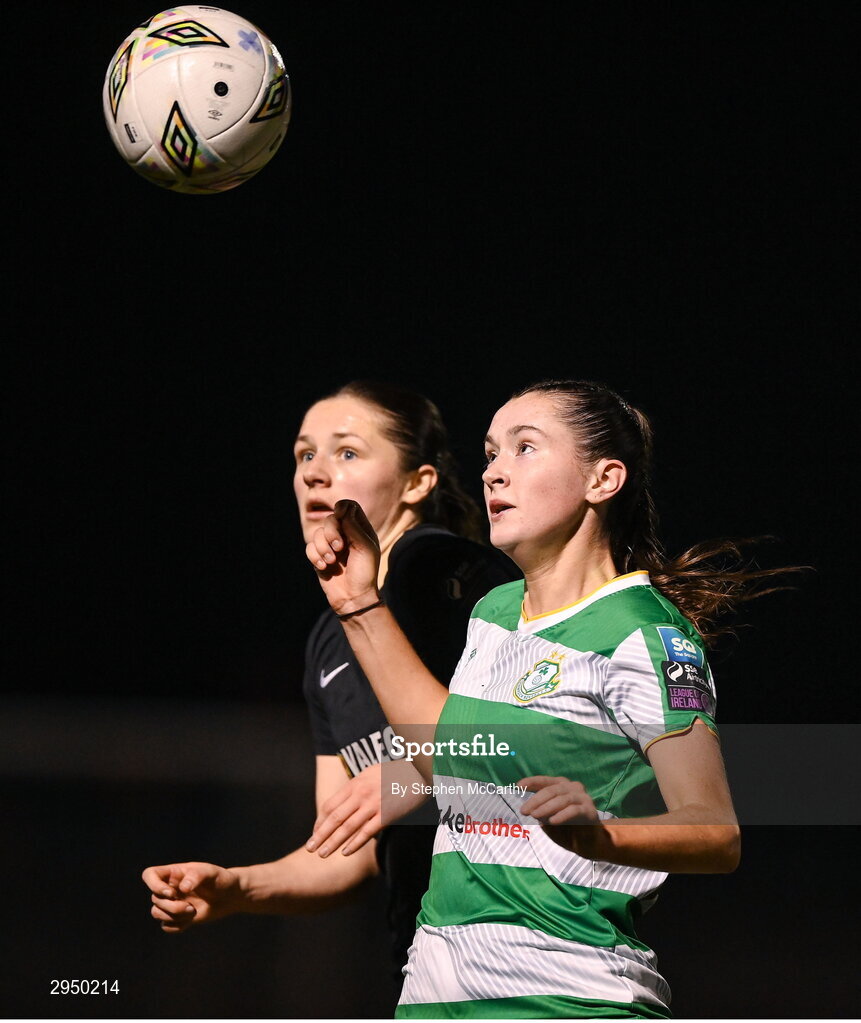 28 September 2024; Melissa O'Kane of Shamrock Rovers in action against Roisin Molloy of Athlone Town during the SSE Airtricity Women's Premier Division match between Athlone Town and Shamrock Rovers at Athlone Town Stadium in Westmeath. Photo by Stephen McCarthy/Sportsfile