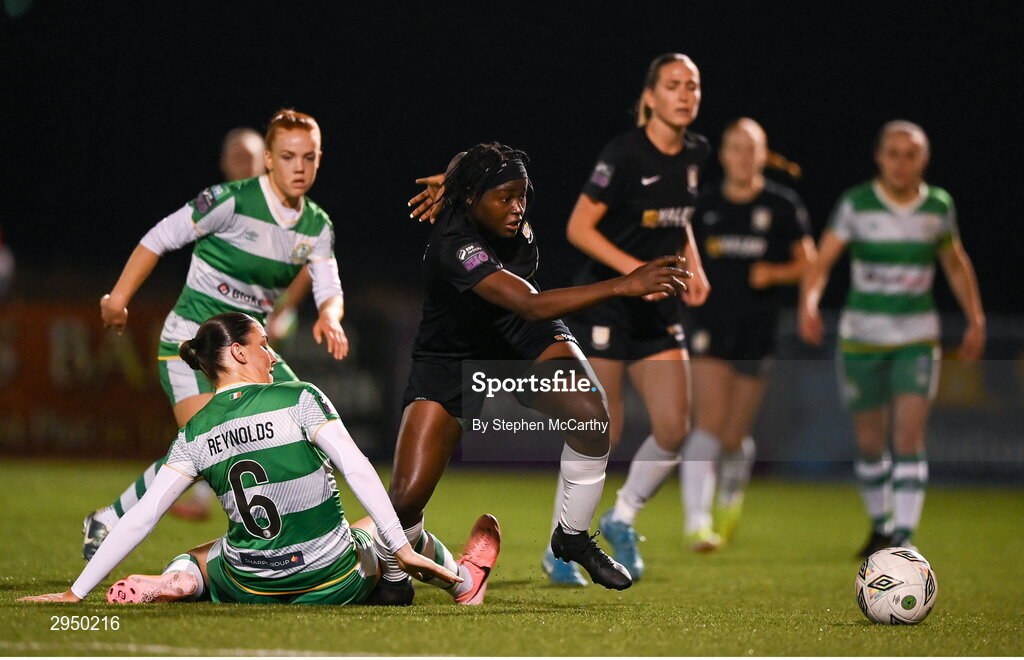 28 September 2024; Brenda Ebika Tabe of Athlone Town in action against Maria Reynolds of Shamrock Rovers during the SSE Airtricity Women's Premier Division match between Athlone Town and Shamrock Rovers at Athlone Town Stadium in Westmeath. Photo by Stephen McCarthy/Sportsfile
