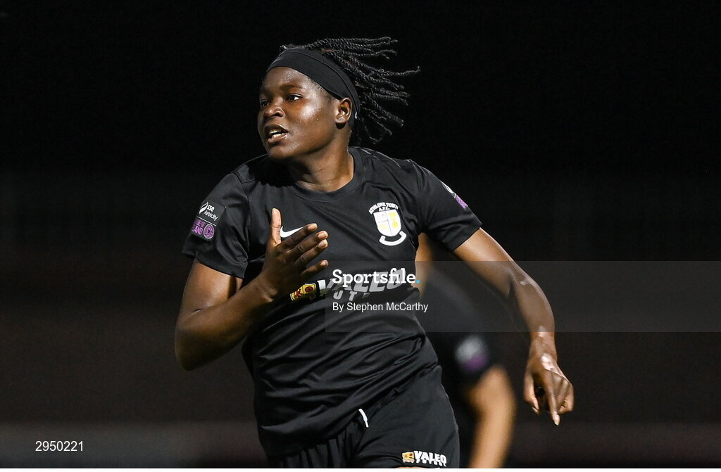28 September 2024; Brenda Ebika Tabe of Athlone Town celebrates after scoring her side's first goal during the SSE Airtricity Women's Premier Division match between Athlone Town and Shamrock Rovers at Athlone Town Stadium in Westmeath. Photo by Stephen McCarthy/Sportsfile