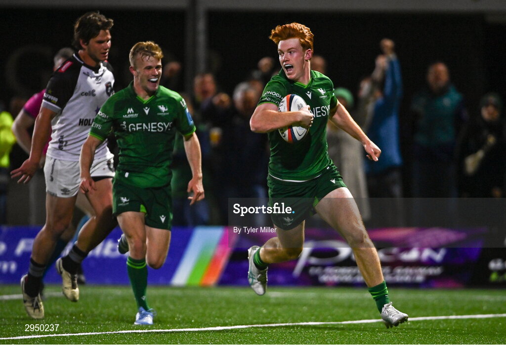 28 September 2024; Shane Jennings of Connacht, right, on his way to scoring his side's third try during the United Rugby Championship match between Connacht and Hollywoodbets Sharks at Dexcom Stadium in Galway. Photo by Tyler Miller/Sportsfile