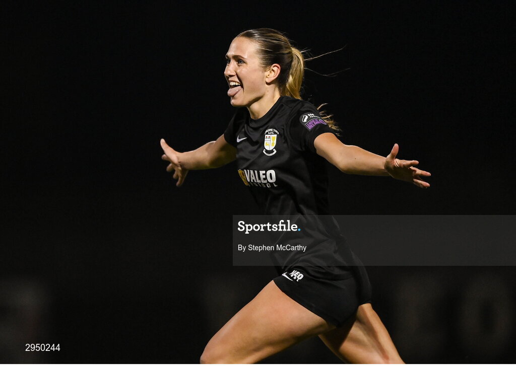 28 September 2024; Madison Gibson of Athlone Town celebrates after scoring her side's second goal during the SSE Airtricity Women's Premier Division match between Athlone Town and Shamrock Rovers at Athlone Town Stadium in Westmeath. Photo by Stephen McCarthy/Sportsfile