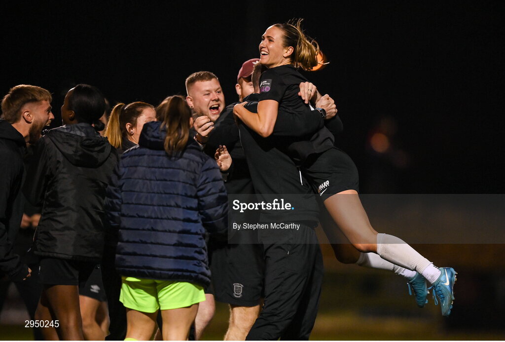 28 September 2024; Madison Gibson of Athlone Town celebrates after scoring her side's second goal with manager Ciaran Kilduff during the SSE Airtricity Women's Premier Division match between Athlone Town and Shamrock Rovers at Athlone Town Stadium in Westmeath. Photo by Stephen McCarthy/Sportsfile