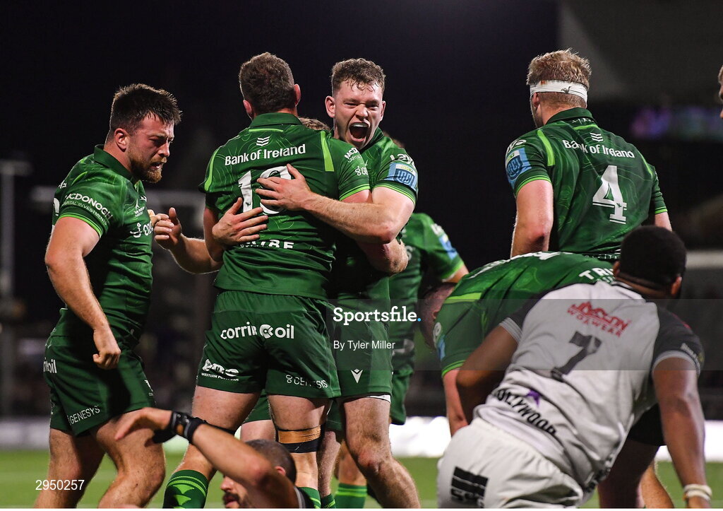 28 September 2024; Oisín Dowling of Connacht, 19, celebrates with team-mate Cathal Forde, right, after scoring their side's fourth try during the United Rugby Championship match between Connacht and Hollywoodbets Sharks at Dexcom Stadium in Galway. Photo by Tyler Miller/Sportsfile