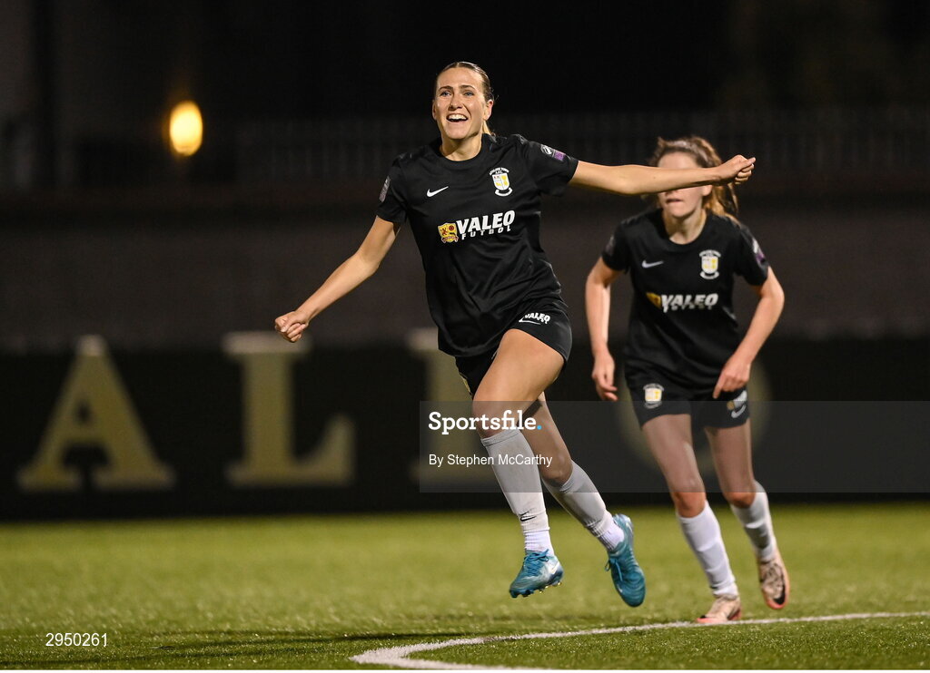 28 September 2024; Madison Gibson of Athlone Town celebrates after scoring her side's third goal during the SSE Airtricity Women's Premier Division match between Athlone Town and Shamrock Rovers at Athlone Town Stadium in Westmeath. Photo by Stephen McCarthy/Sportsfile