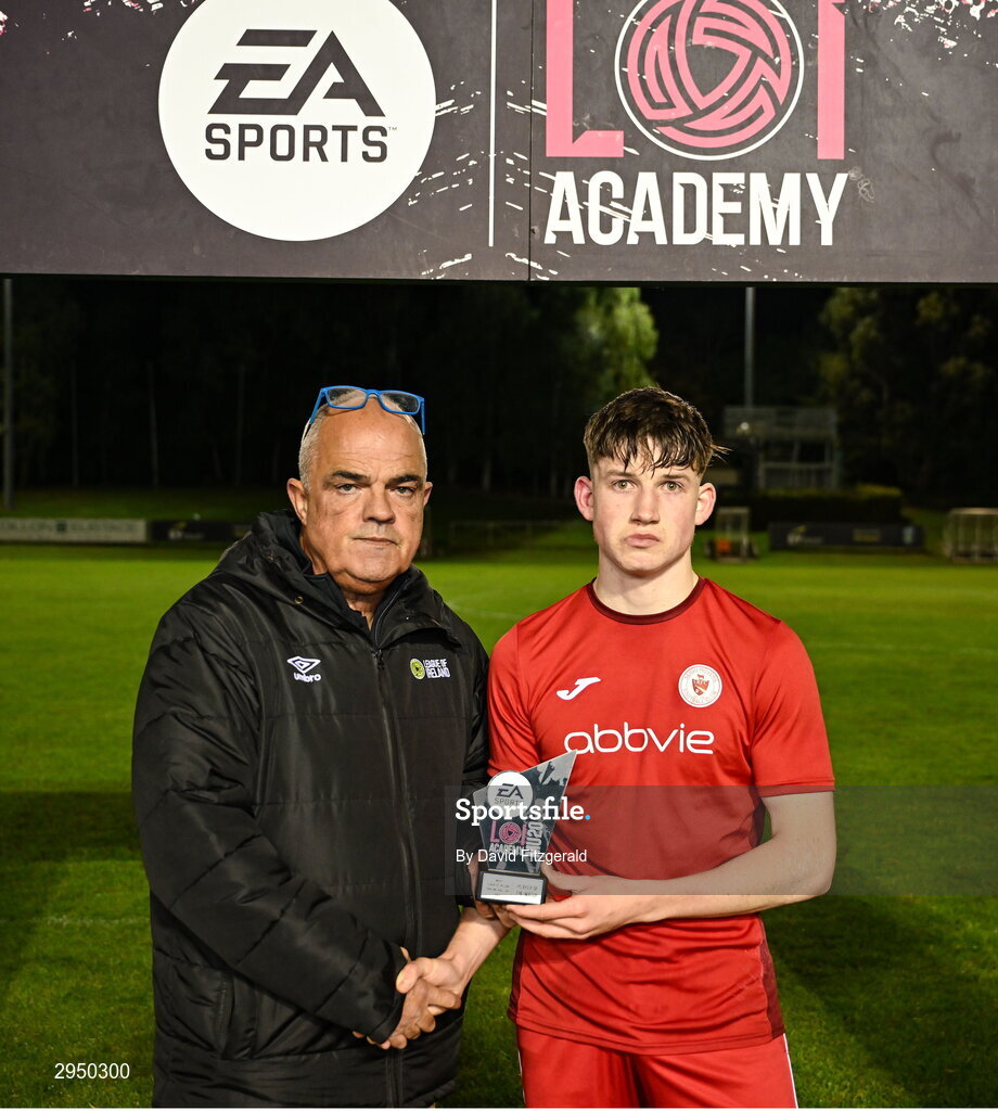 28 September 2024; Man of the match Thomas Morley of Sligo Rovers is presented with the award by Pat Duffy after the EA SPORTS MU20 League of Ireland Enda McGuill Cup final match between UCD and Sligo Rovers at UCD Bowl in Belfield, Dublin. Photo by David Fitzgerald/Sportsfile