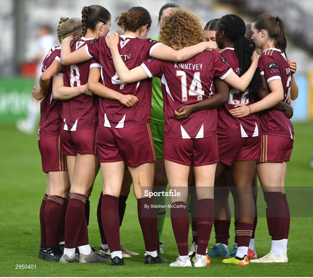 28 September 2024; Galway United players huddle before the SSE Airtricity Women's Premier Division match between Galway United and Shelbourne at Eamonn Deacy Park in Galway. Photo by Stephen McCarthy/Sportsfile