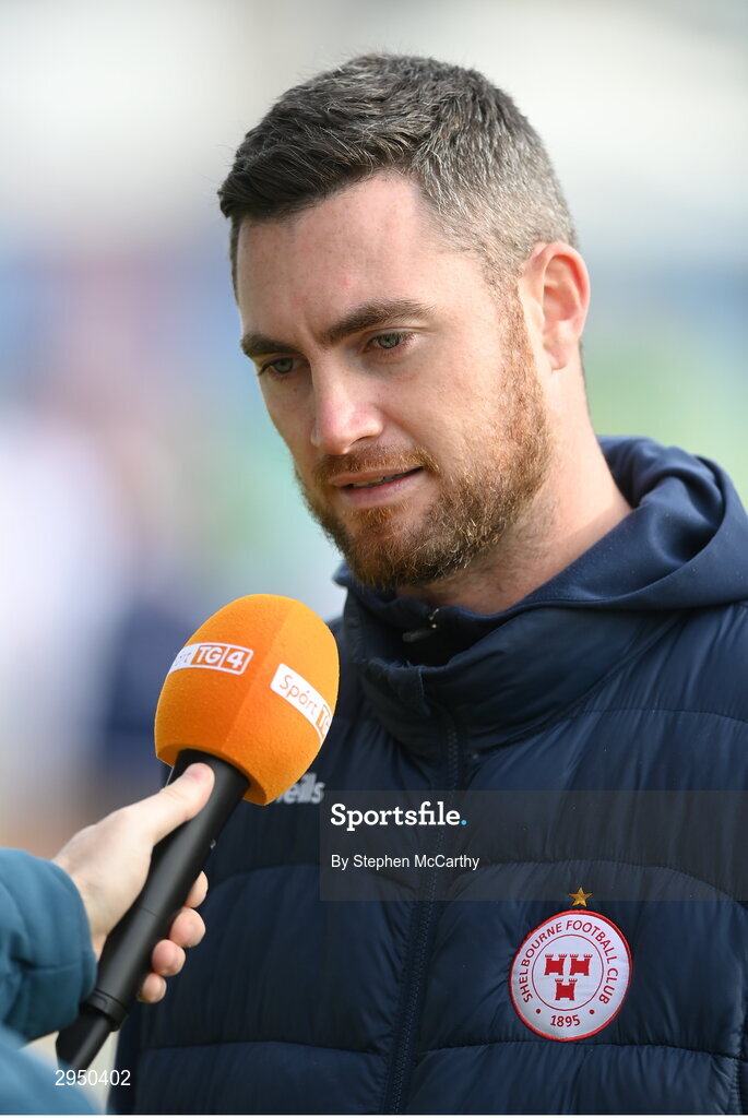 28 September 2024; Shelbourne manager Eoin Wearen speaks to TG4 before the SSE Airtricity Women's Premier Division match between Galway United and Shelbourne at Eamonn Deacy Park in Galway. Photo by Stephen McCarthy/Sportsfile