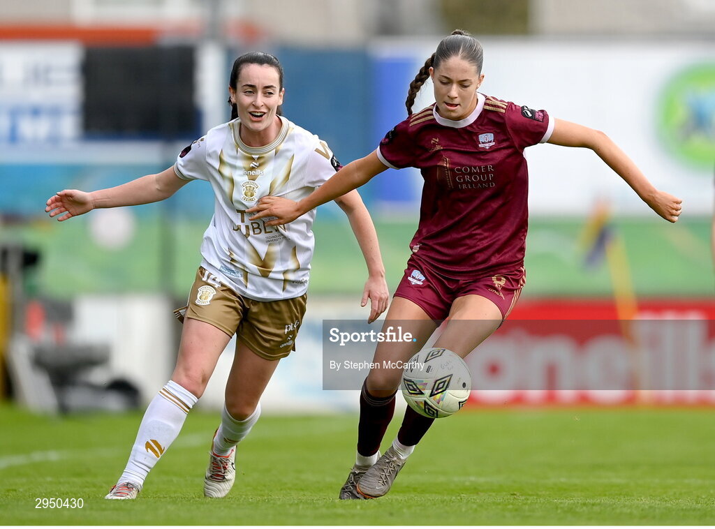 28 September 2024; Kate Thompson of Galway United in action against Roma McLaughlin of Shelbourne during the SSE Airtricity Women's Premier Division match between Galway United and Shelbourne at Eamonn Deacy Park in Galway. Photo by Stephen McCarthy/Sportsfile