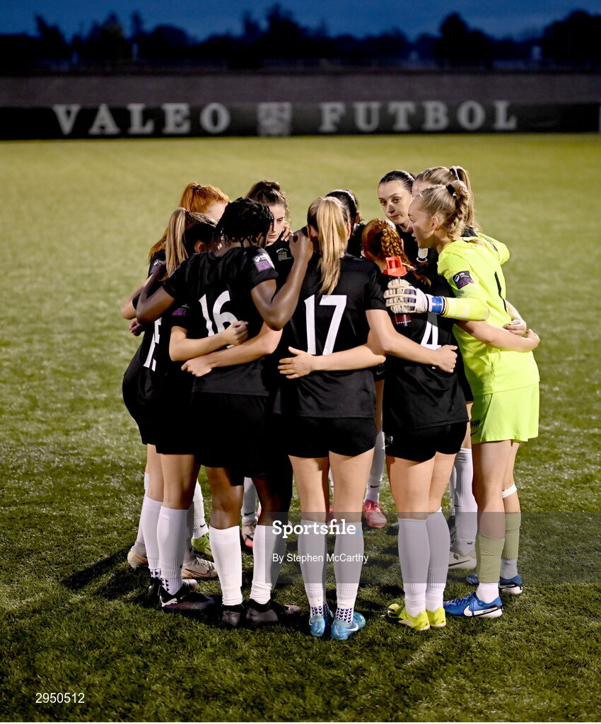 28 September 2024; Athlone Town players huddle before the SSE Airtricity Women's Premier Division match between Athlone Town and Shamrock Rovers at Athlone Town Stadium in Westmeath. Photo by Stephen McCarthy/Sportsfile