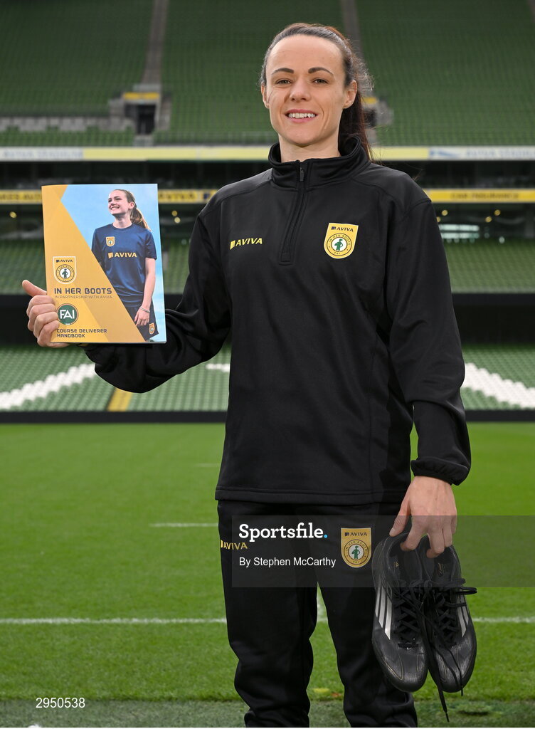 29 September 2024; Áine O’Gorman, Shamrock Rovers captain and Ireland WNT centurion, at the In Her Boots launch in Aviva Stadium, Dublin. Aviva, in partnership with the Football Association of Ireland (FAI), has launched In Her Boots, which is a new programme providing girls aged between 9-16 with specialist mentorship and coaching. Photo by Stephen McCarthy/Sportsfile